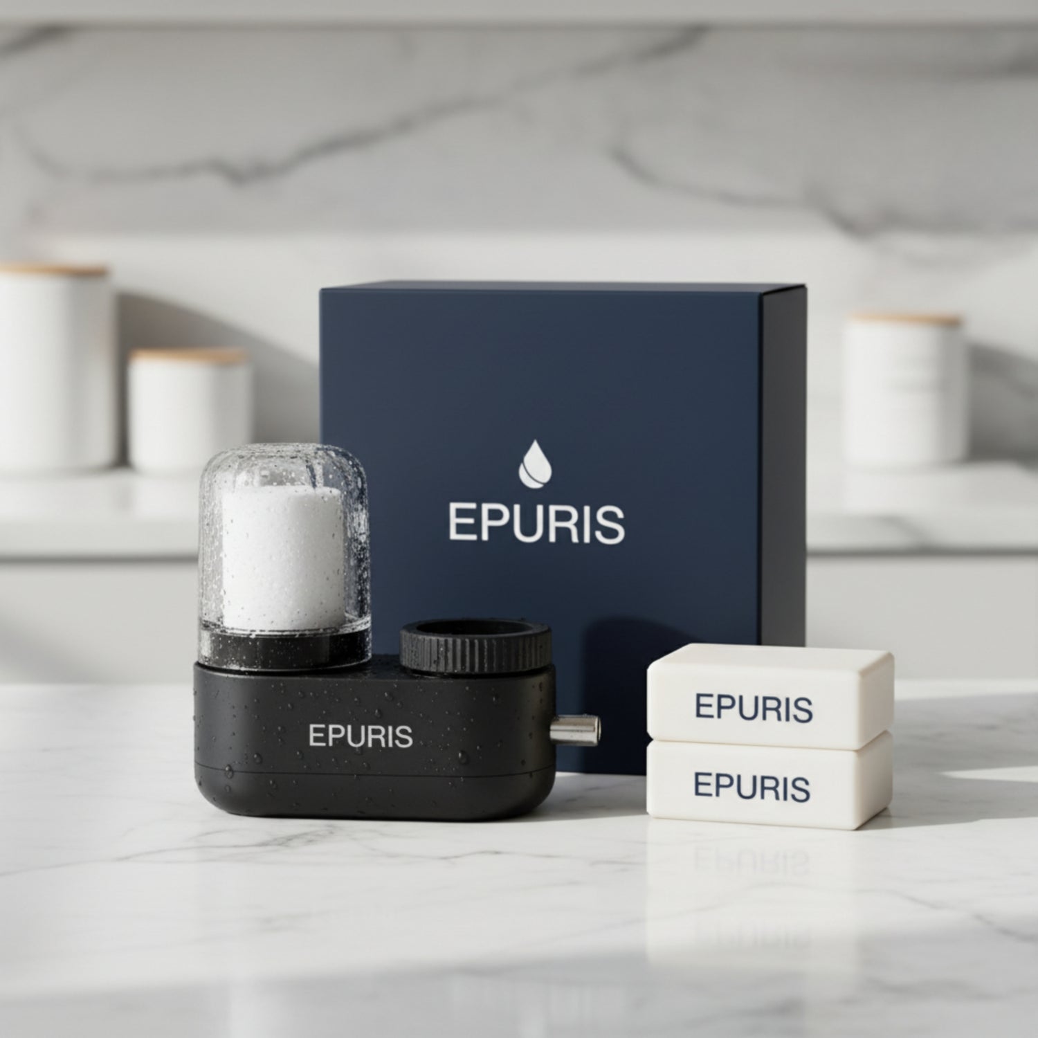 Epuris élimine le chlore, les métaux lourds, la rouille, les bactéries et les micro-particules, tout en préservant les minéraux essentiels à ta peau.